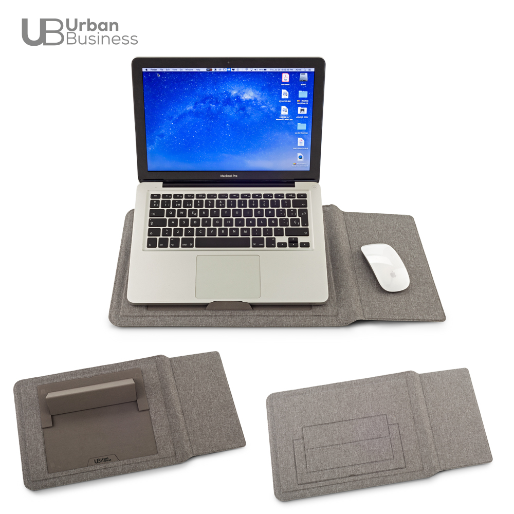 Tiene un soporte plegable el cual se ajusta máximo a computadores de 16”, la solapa funciona como mouse pad y tiene un compartimiento para documentos. Empaque caja individual.